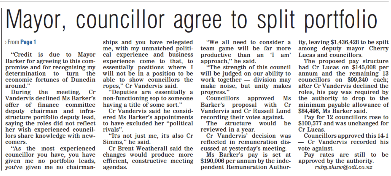Today’s ODT front page Chairs story relegates my sidelining by Mayor Barker to page 3 as follows: