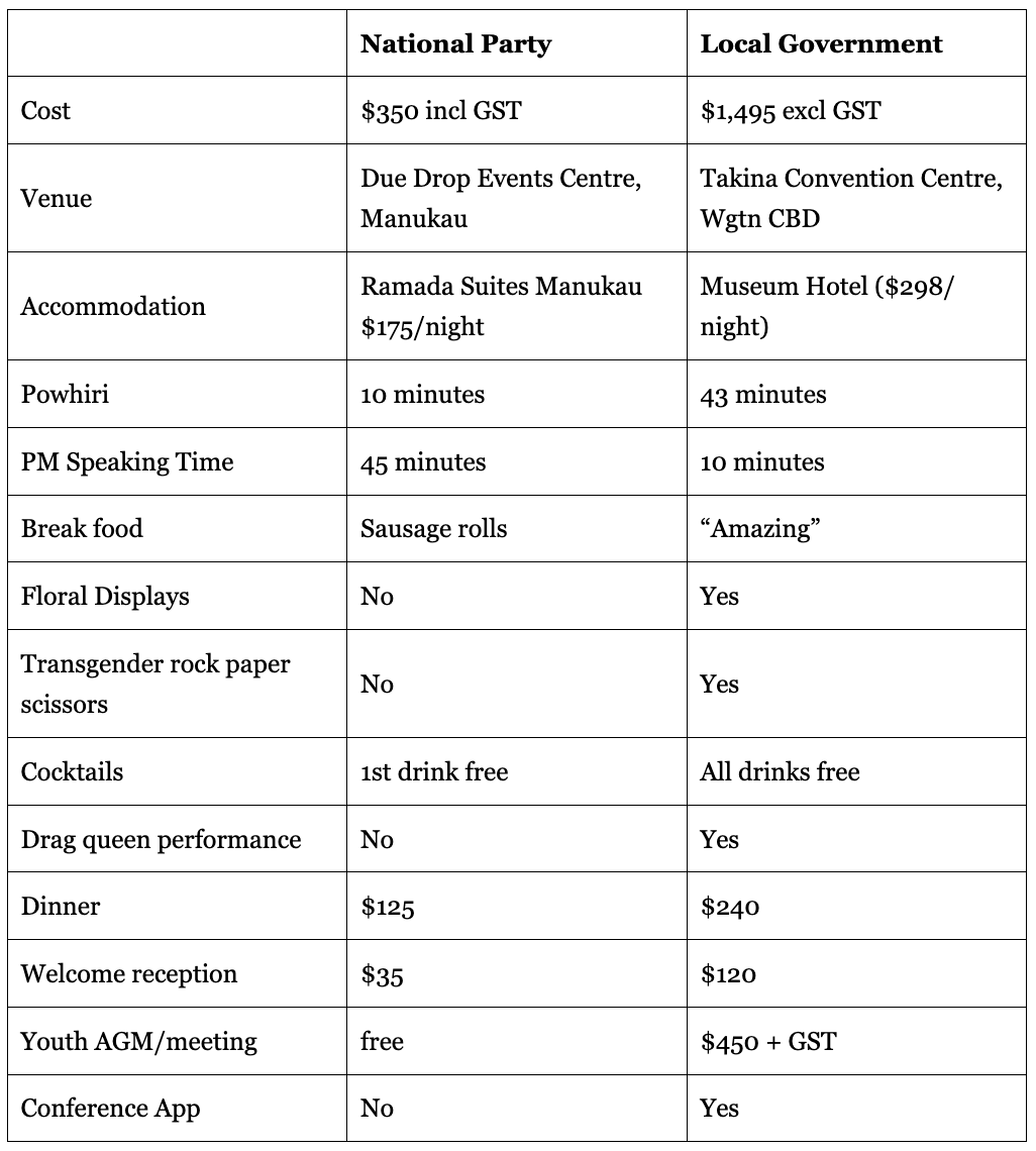 A number of readers attended both the recent National Party Annual Conference and the Local Government annual conference. They were struck by the differences between the two. A key factor being that those who attend the National conference pay the cost themselves and those who attend the LG conference have ratepayers pay the cost.